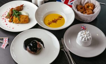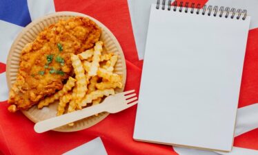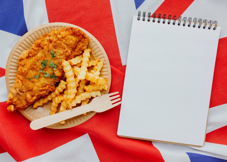 Fish and Chips: Crispy fried fish served with golden chips (French fries), seasoned with salt and vinegar.